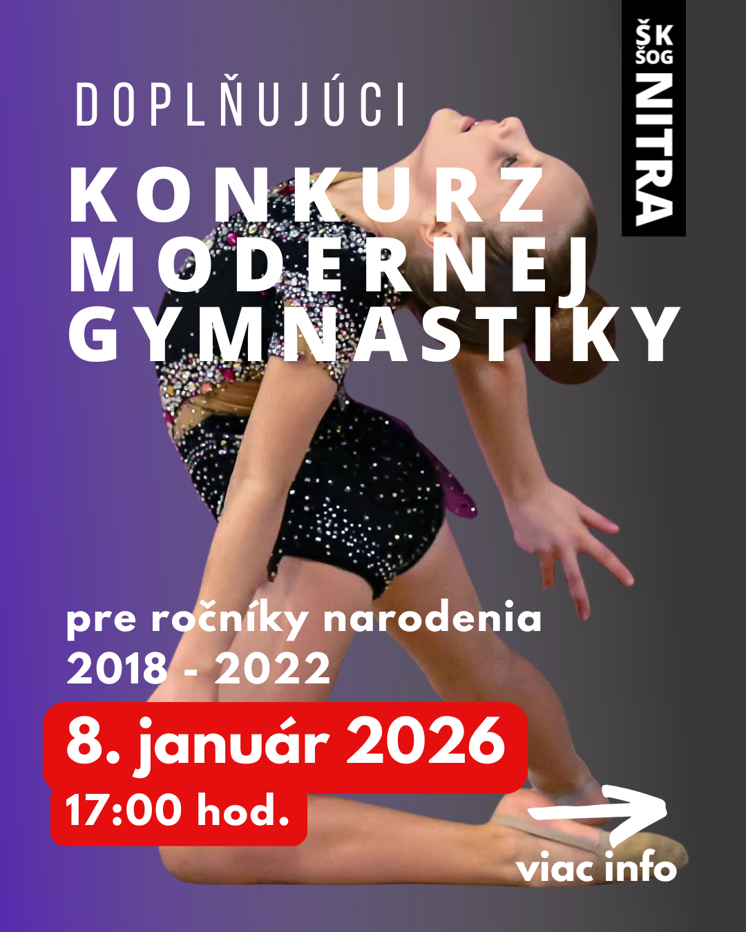Ak ste nestihli septembrový konkurz alebo stále váhate, je tu PRÍLEŽITOSŤ prihlásiť vaše dievčatko do oddielu modernej gymnastiky ŠK ŠOG Nitra.TERMÍN: ŠTVRTOK 8. JANUÁR 2026 o 17.00 hod.MIESTO: ŠH Olympia, Chrenovská ul. 23/16 Nitra, vstup zboku telocvične to strany OC Max.Uprednostňujeme deti narodené 2018 - 2022.